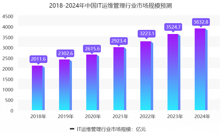 IT运维管理行业市场容量将呈现出逐年增长态势,到2024年IT运维管理行业市场规模将达到3832.8亿元。资料来源:智研咨询整理